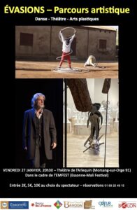 Vendredi 27 janvier, 20h30 Théâtre de l’Arlequin – 37 rue Jean-Raynal – 91390 Morsang-sur-Orge – Parcours Evasions 1 : « #marenostrum (installation d sulcptures)/ « Je est un autre » (théâtre) / « Entre Nous » (danse)