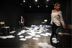 Sur le plateau tout est au plus simple, au plus proche, sans tralala d’époque. Sous des lumières presque crues, un homme et une femme s’attirent l’un l’autre et se repoussent l’un l’autre. Ils se tiennent à distance, se frôlent, s’étreignent, dansent, se désirent, s’écartent à nouveau. La scène : un atelier, des bâches barbouillées sur lesquelles les acteurs écrivent à l’eau ou avec une encre qui s’efface, des mots, des noms de lieux, des dates, font quelques dessins. Des feuilles volent et jonchent le sol. Ce sont des limbes, comme celles de la littérature. Un lieu abstrait, une boite d’entomologiste qui autorise le réalisme parce qu’elle le met à distance.